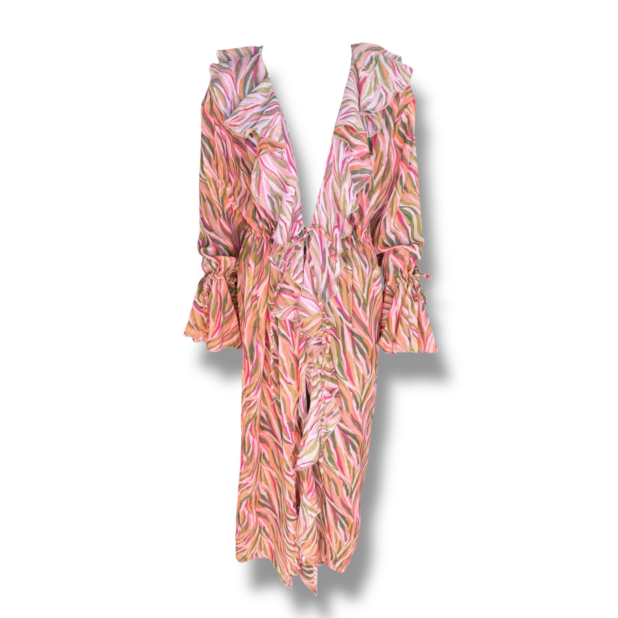 קימונו חוף עליונית בגזרת קימונו עשויה מבד שיפון בהדפסה מיוחדת , מעוצבת בגזרה שמאפשרת קשירה באזור המותן וכף היד לובשים אותה מעל בגד ים לסט מושלם או כפריט סטיילינג נפרד שמקפיץ כל לוק בד נשפך ונעים על הגוף שרוולים רחבים בגזרת פעמון חגורת קשירה במותן מתאימה כסט לבגד ים מגיעה בגזרת one size