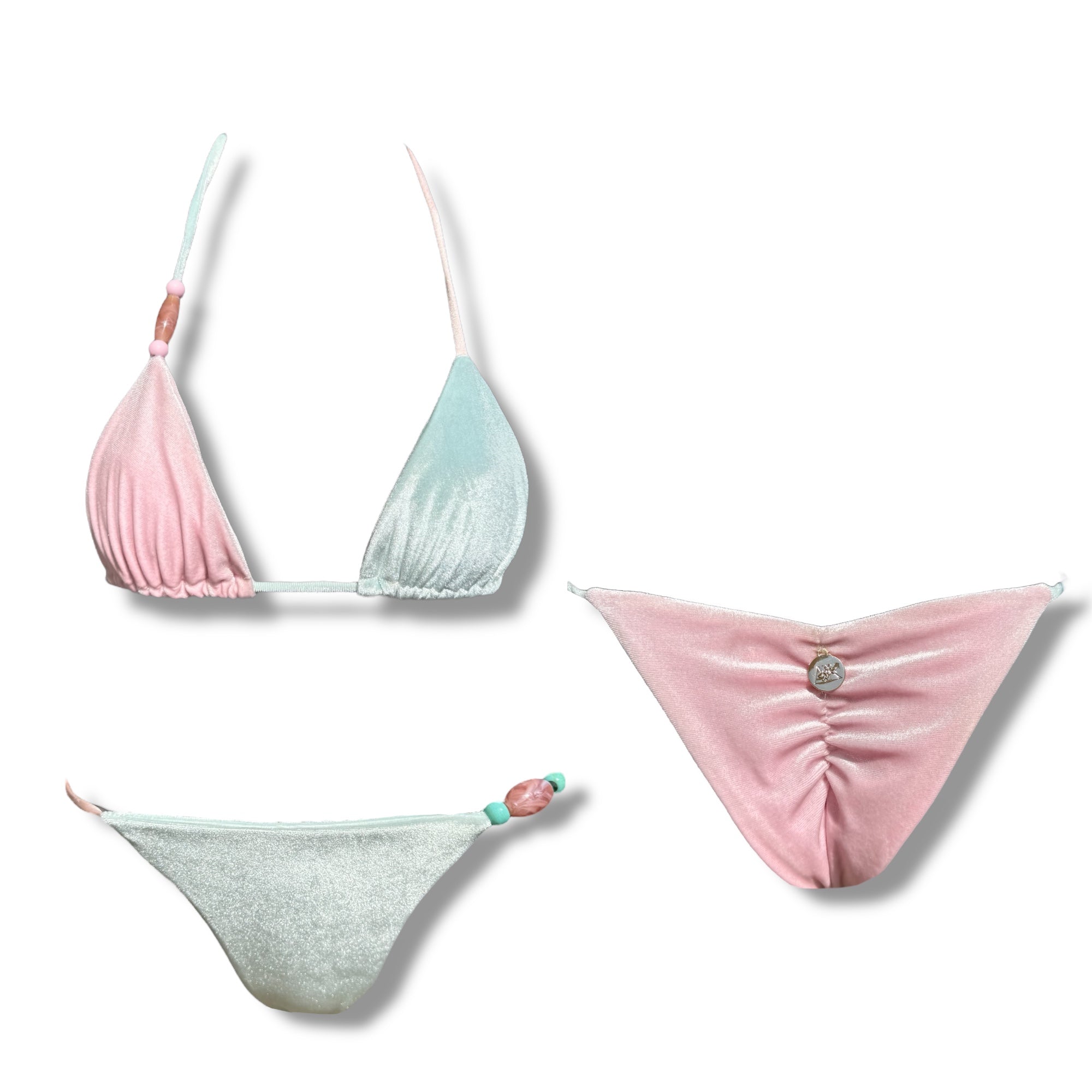 ביקיני קלאסי בגזרת משולשים עם תחתון קשירה דו צבעי בבד קטיפתי בגווני תכלת, ורוד ובייבי מעוטר בחרוזים ביקיני בעיצוב חכם ומדויק שמשלב בין טרנדיות ונוחות על זמנית . מגיע עם בטנה תואמת מאותו בד. הטופ בגזרת משולשים קלאסית עם תמיכה יציבה, ותחתון קשירות עם כיווצים בתוספת חרוזים בגווני הבגד ים מתאים לשיזוף ונוחות לאורך כל היום.