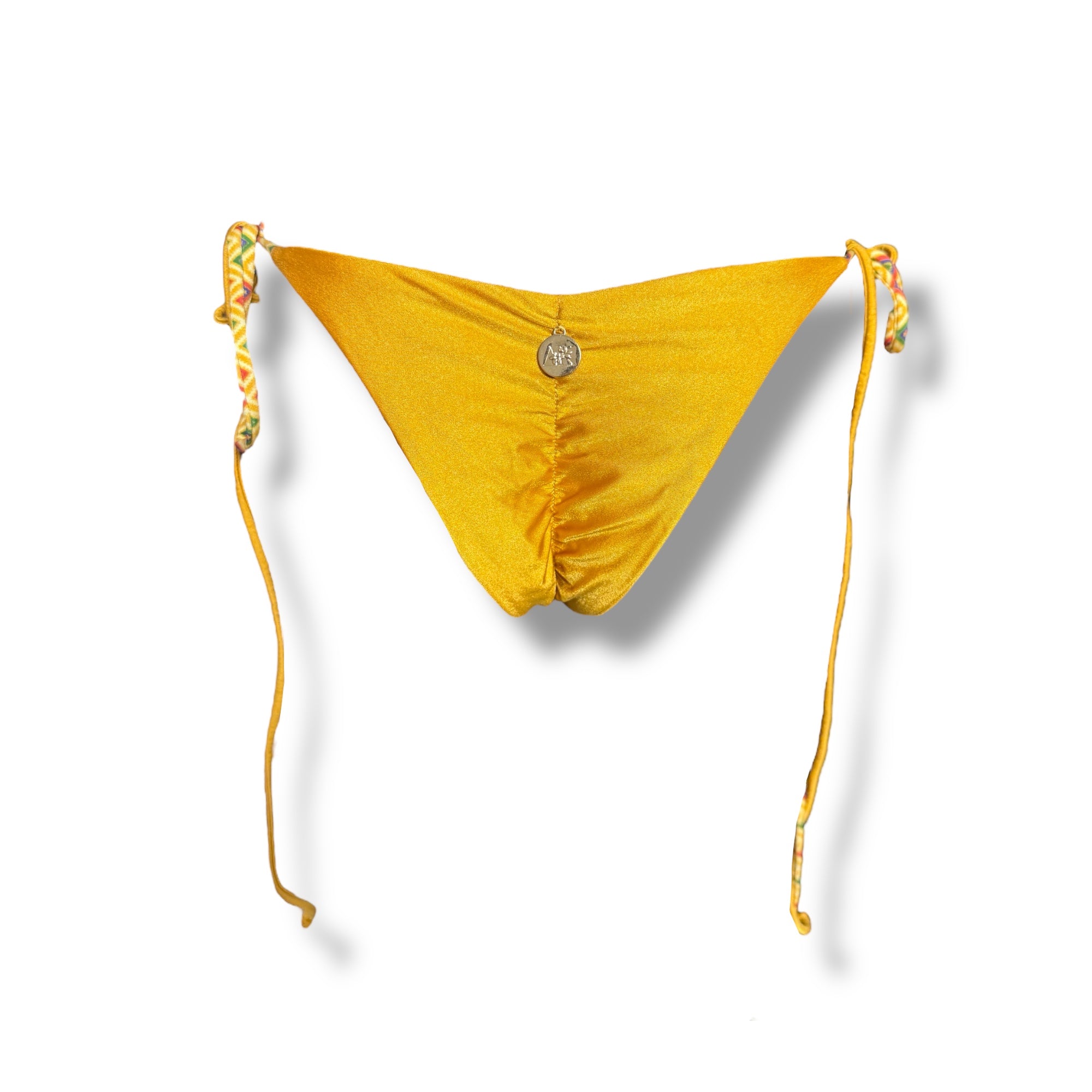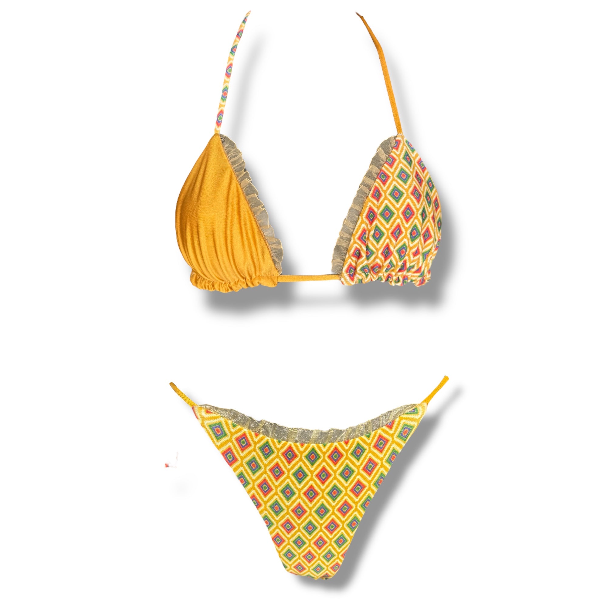 ביקיני קלאסי בגזרת משולשים עם תחתון קשירה דו-צבעי בגווני חרדל בהדפס וינטג׳ מקורי וייחודי. ביקיני בעיצוב חכם ומדויק, המשלב בין צבעוניות טרנדית ונוחות על-זמנית. החזייה בגזרת משולשים עם סרט אורגנזה בגוון חרדל שקפקף שמוסיף טאץ’ קליל. התחתון בגזרת קשירות משני הצדדים , בצד הקידמי הבד מהדפס מקורי ובצד האחורי הבד בגוון חרדל.