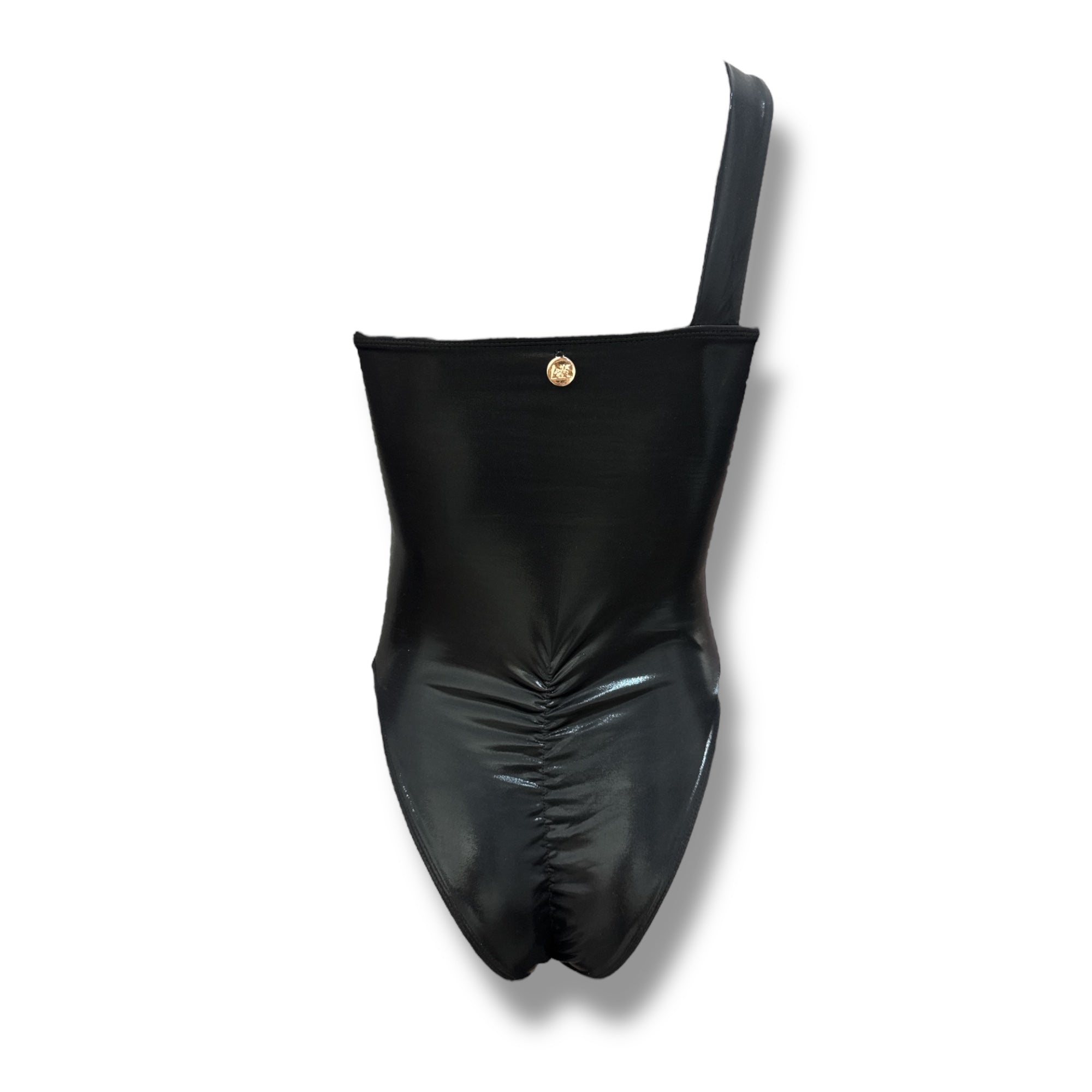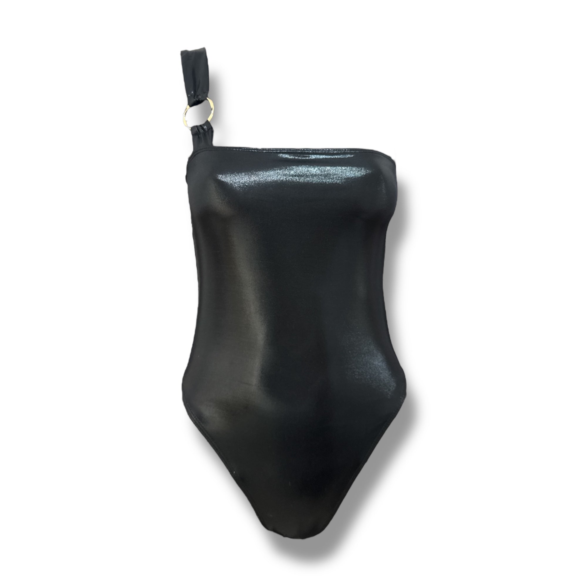 בגד ים שלם סטרפלס קלאסי עם כיווצים בישבן בצבע שחור עמוק מבריק בגזרת one sholder הדגם עוצב מבד שחור מבריק עם בטנה שחורה שכולל רצועה רחבה להחזקת החזה שמעוטרת בטבעת מתכת מוזהבת שמשדרת יוקרה ועוצמה . החלק העליון יושב צמוד על החזה ללא תפרים או קווים חותכים ליצירת מראה נקי מנימליסטי ונשי. הגב אחיד ללא קשירות לאחיזה חלקה ומדויקת. גזרת התחתון גבוהה בירכיים עם חיתוך בצורת v שמדגיש את קווי הרגליים. *מתאים למי שאוהבת להיות הדרמה של החוף ולא חלק מהרקע*