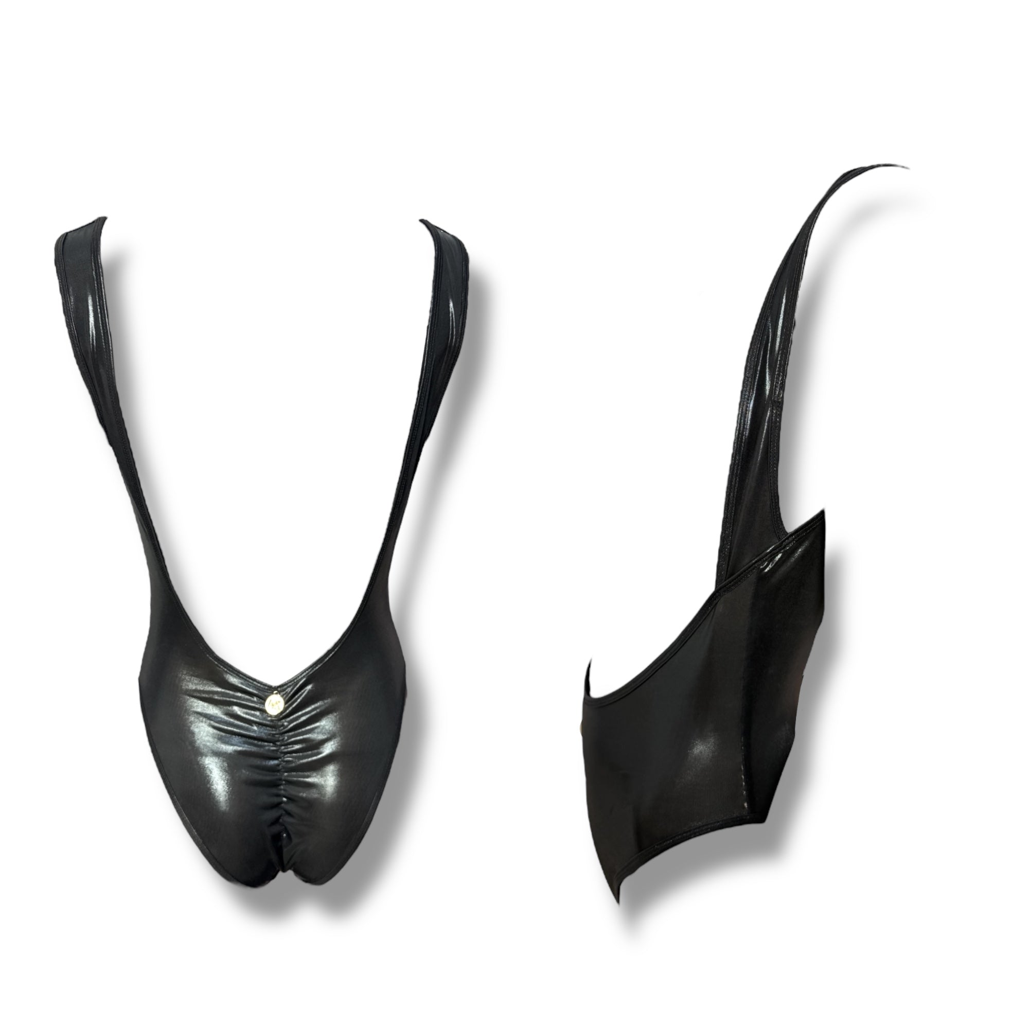 בגד גוף קלאסי עם כיווצים בישבן , הדגם מגיע עם פתח עמוק בחזה ובגב ליצירת מראה של אביזר משלים לבגדי הים שלנו / שלך בגימור שחור מבריק עם בטנה בצבע גוף. הדגם הוא תוספת לכל בגד ים שיש לך בארון ומעניק שילוב של שני עולמות : בגד ים שלם עם תחושה של ביקיני.