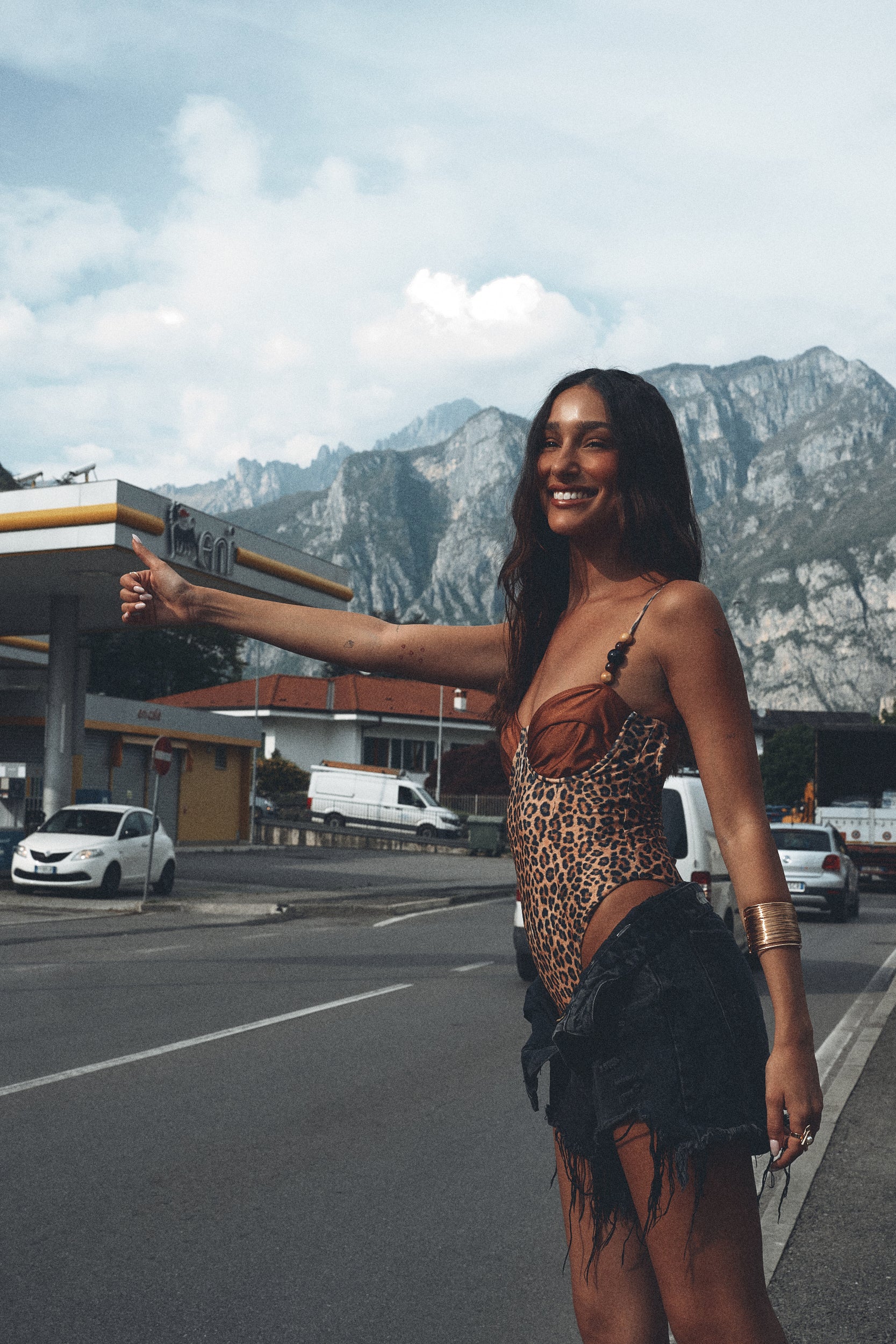 עוצב מבד מנומר פראי , בד חום מטאלי עם בטנה תואמת הדגם מעוטר בחרוזיי עץ , חרוזים חומים וחרוז אחד שחור שמוסיפים טאץ בוהו מדויק.