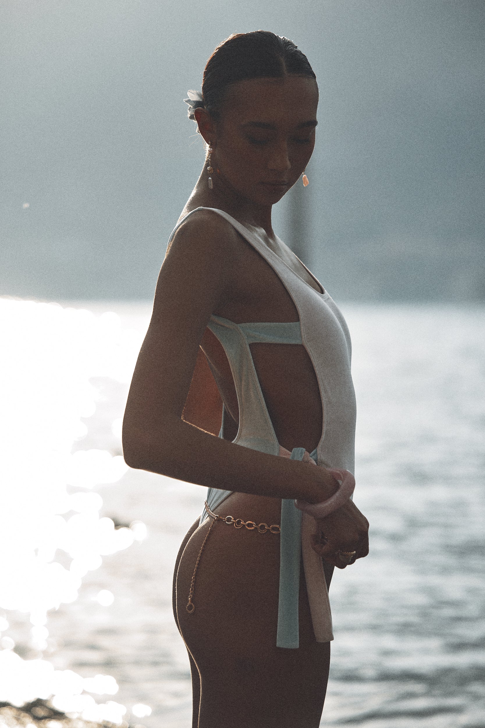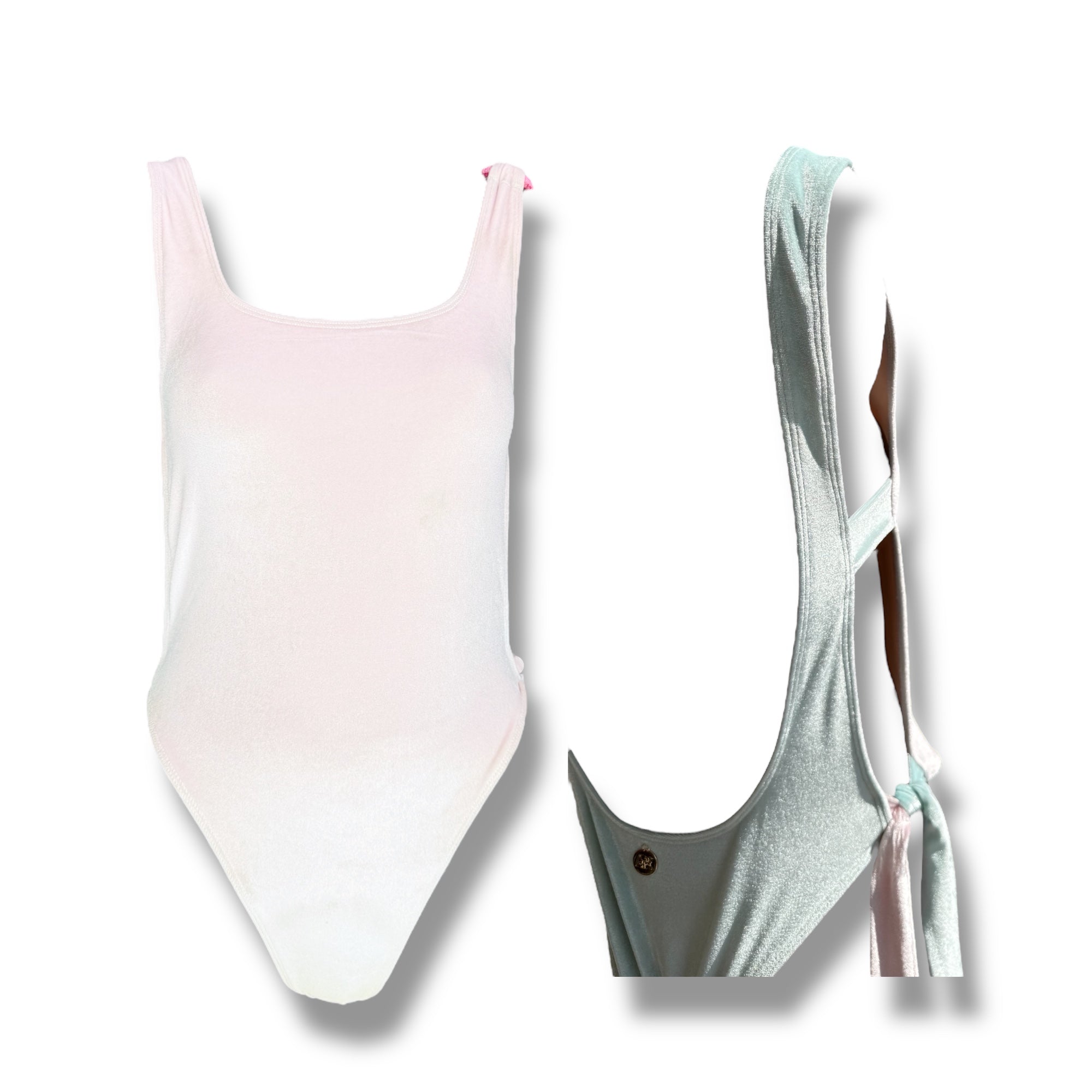 בגד ים שלם בעיצוב מיוחד עם גב פתוח וקשירות צד בגווני תכלת ורוד ובייבי גזרה גבוהה ומחמיאה במיוחד , בשילוב בד קטיפה נמתח ונעים בגוון תכלת ורוד פנינה רך, גמיש ומבריק כתפייה אחת מעוצבת ומחוברת בטבעת קש ורודה. קשירות בצד הגוף מאפשרות התאמה מושלמת לגוף ומוסיפות טאץ’ קיצי נונשלנטי.