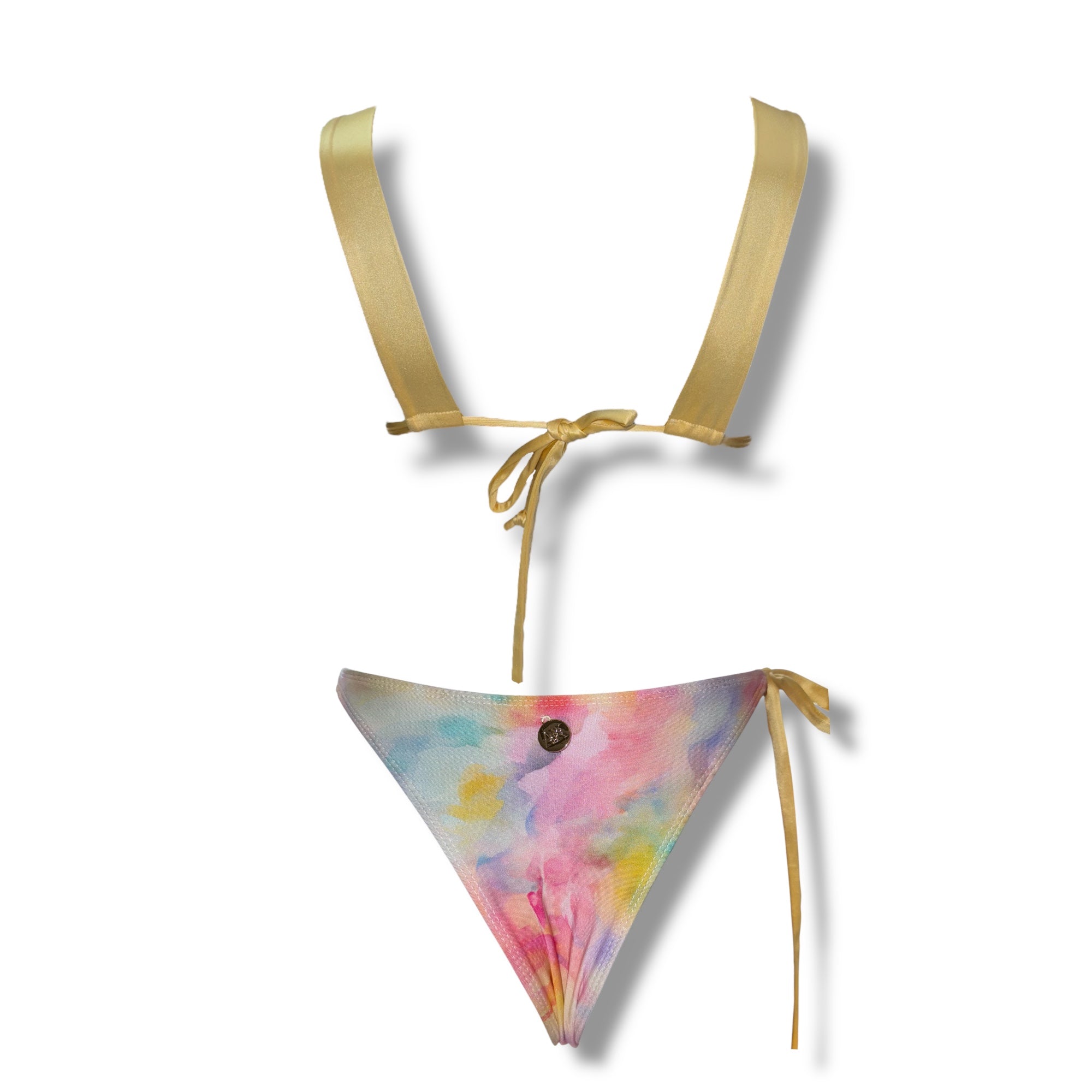 בגד ים שני חלקים בגזרת משולשים ותחתון מתכוונן עם מסילה עבה עשוי מבד בהדפס מקורי במיוחד ביקיני קלאסי בעיצוב מחמיא עשוי מבד לייקרה. החזיה בגזרת משולשים שמתאימה גם לחזה קטן / בינוני/ גדול ,יושבת צמוד ונעים על הגוף, ללא תפרים חיצוניים ליצירת מראה חלק, אלגנטי ונשי התחתון בגזרת טנגה מתכווננת ללא תפרים חיצוניים להשלמת מראה מינימליסטי וחד בגזרה שמתאימה לכל צורת גוף עם בטנה תואמת בגימור חלק ונעים למגע.