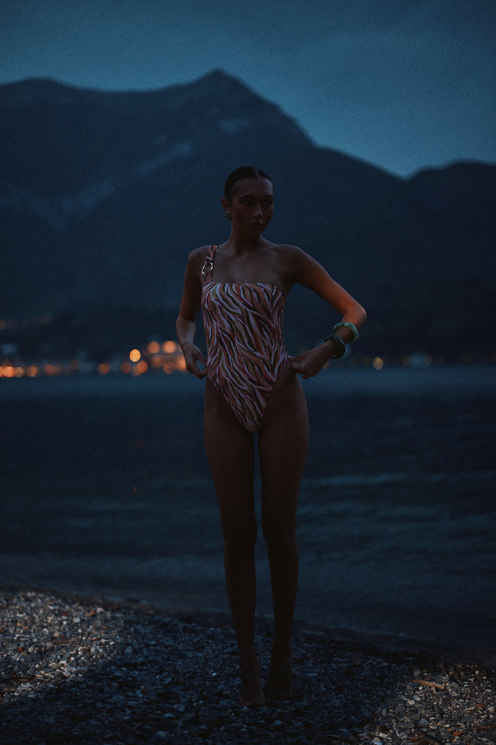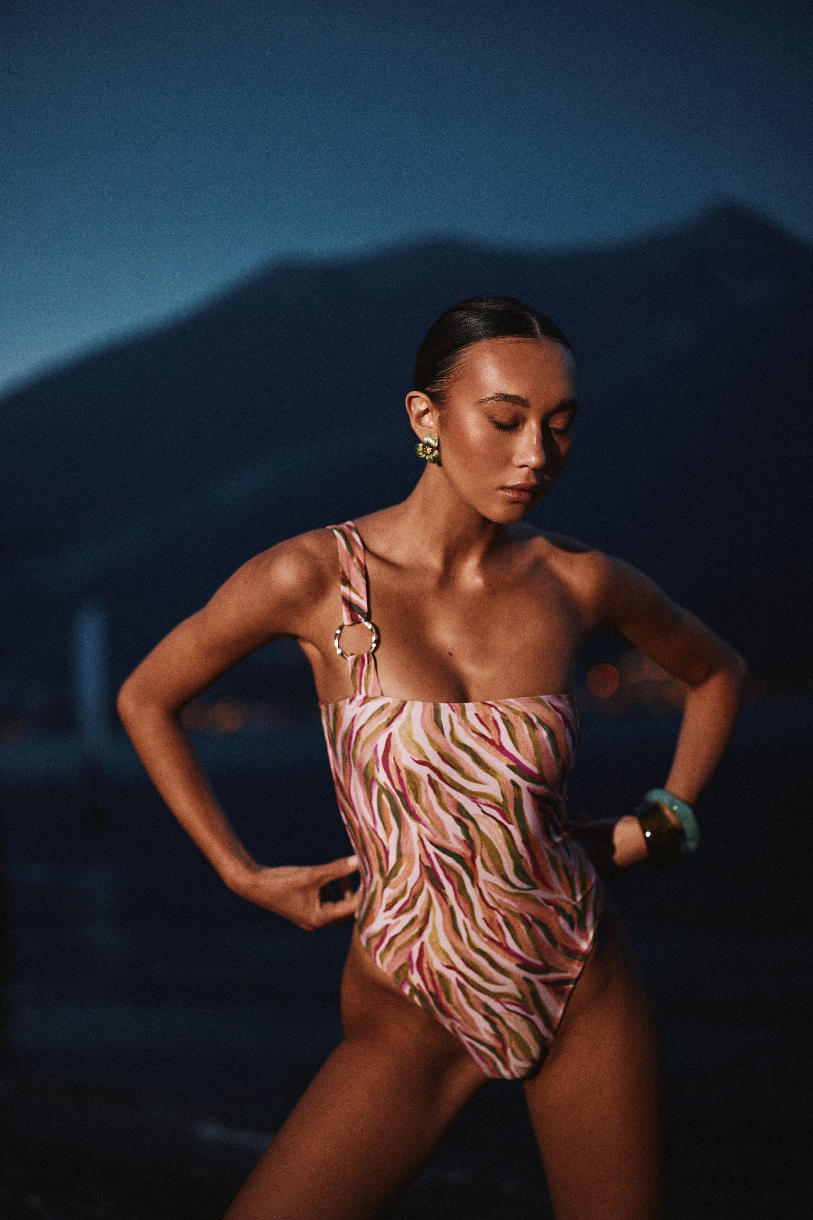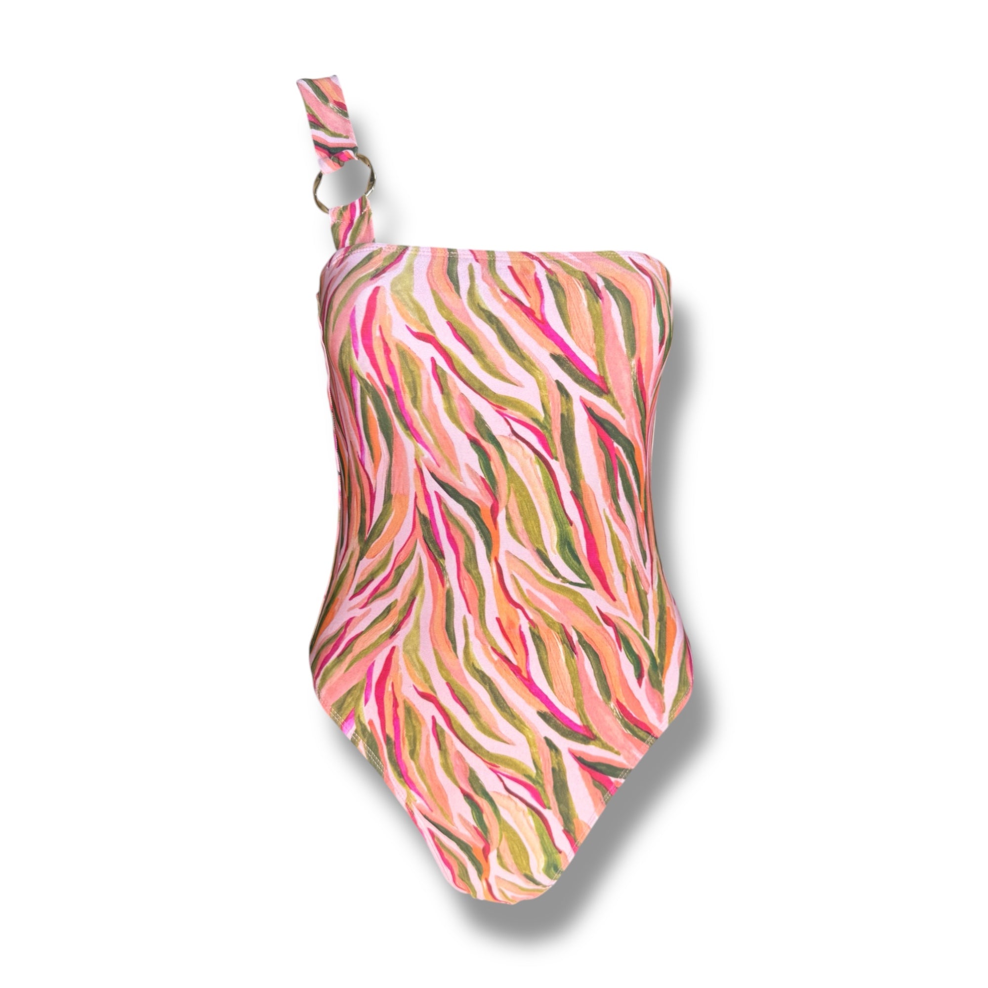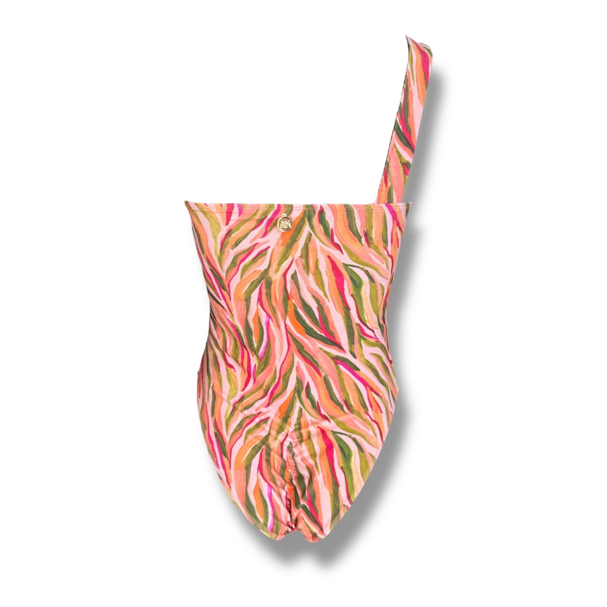 בגד ים שלם סטרפלס קלאסי עם כיווצים בישבן בהדפס זברה מטאלי מנצנץ , עוצב מבד מזובר פראי עם בטנה תואמת.