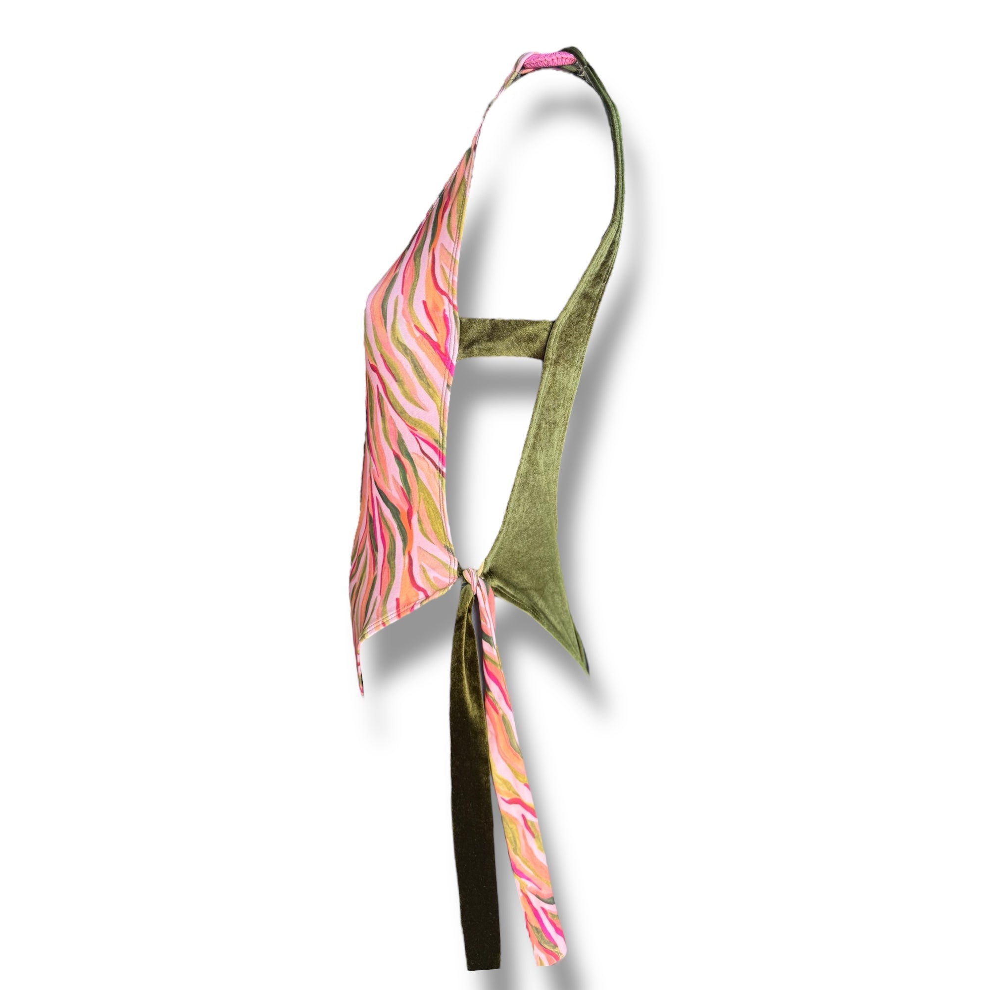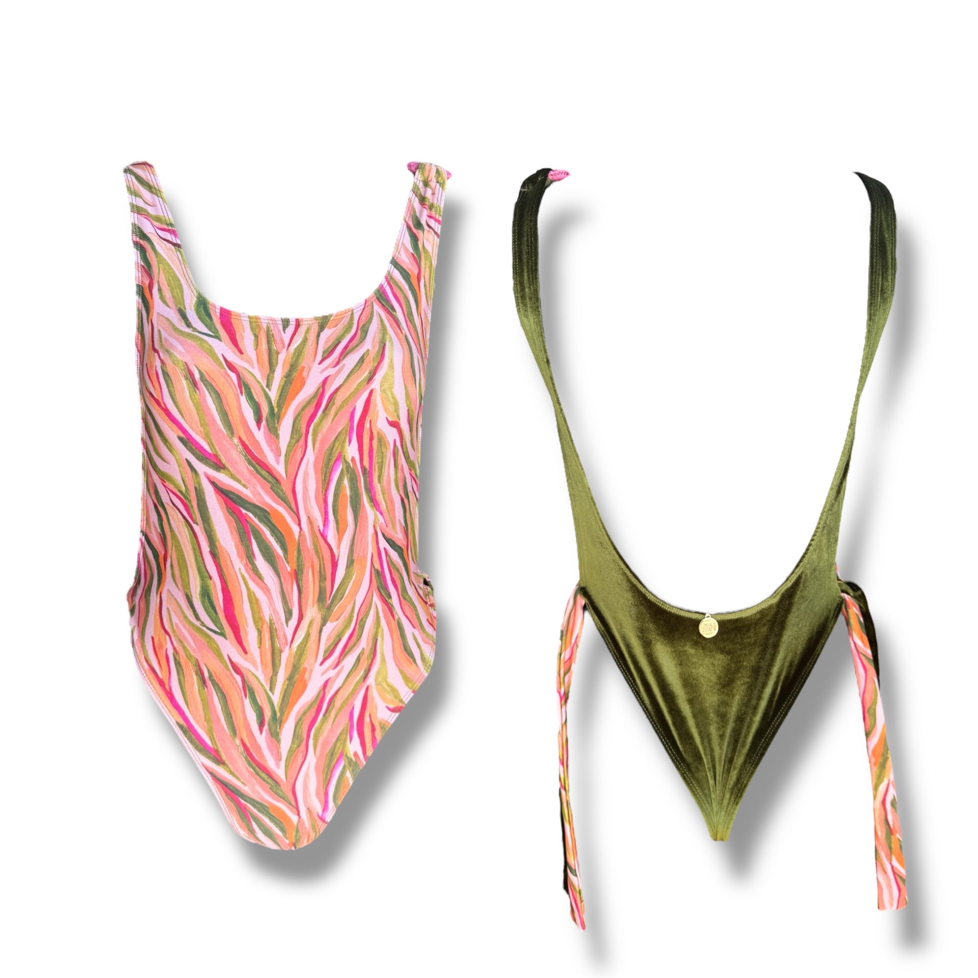 בגד ים שלם בעיצוב מיוחד בהדפס פראי בגווני ורוד, כתום, ירוק וקש עם גב פתוח וקשירות צד.