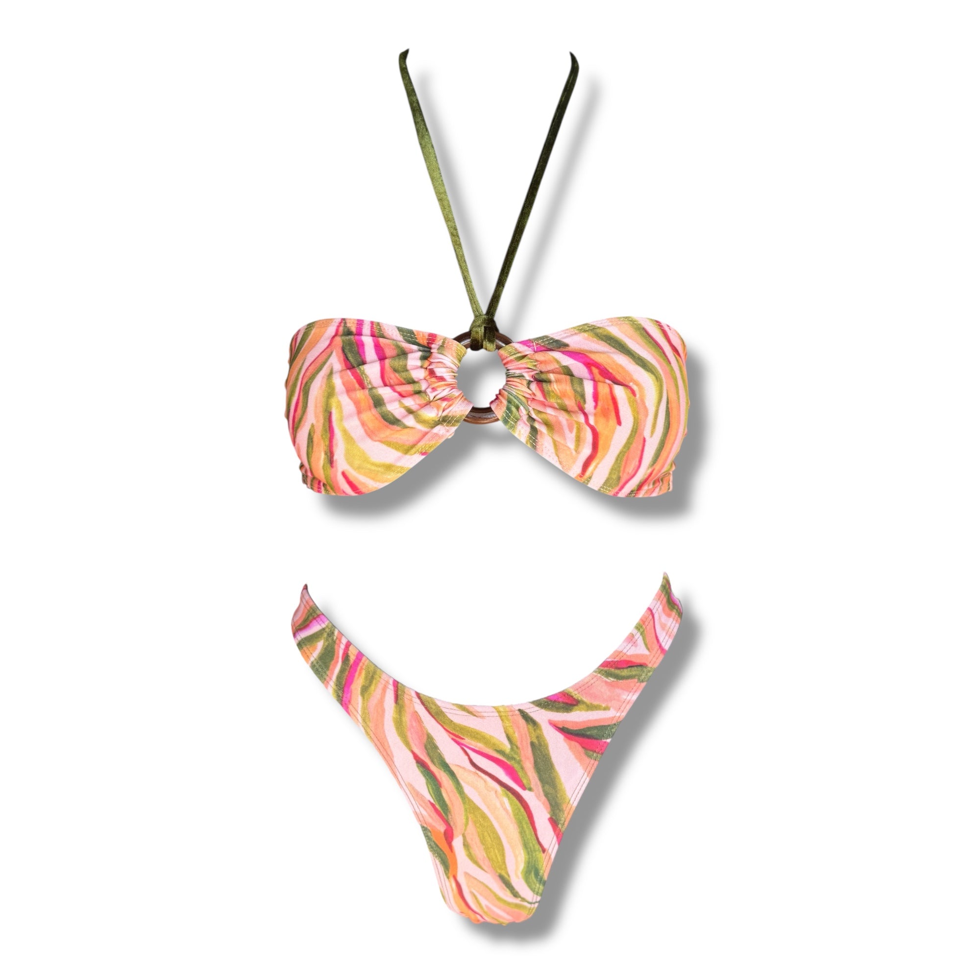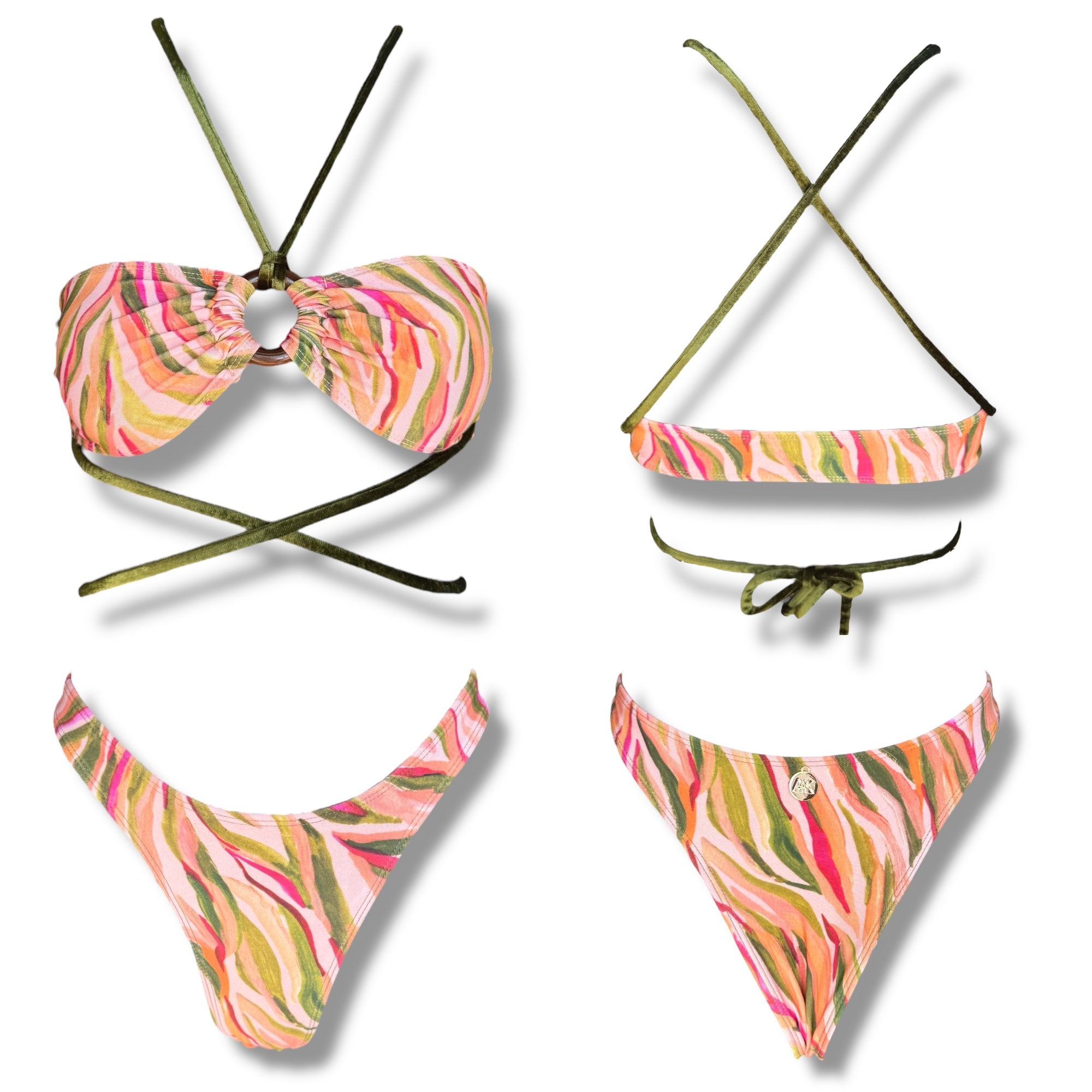 בגד ים סטרפלס טופ עם חוטים נשלפים לבחירה בגווני ירוק קטיפה והדפס מזובר מקורי.